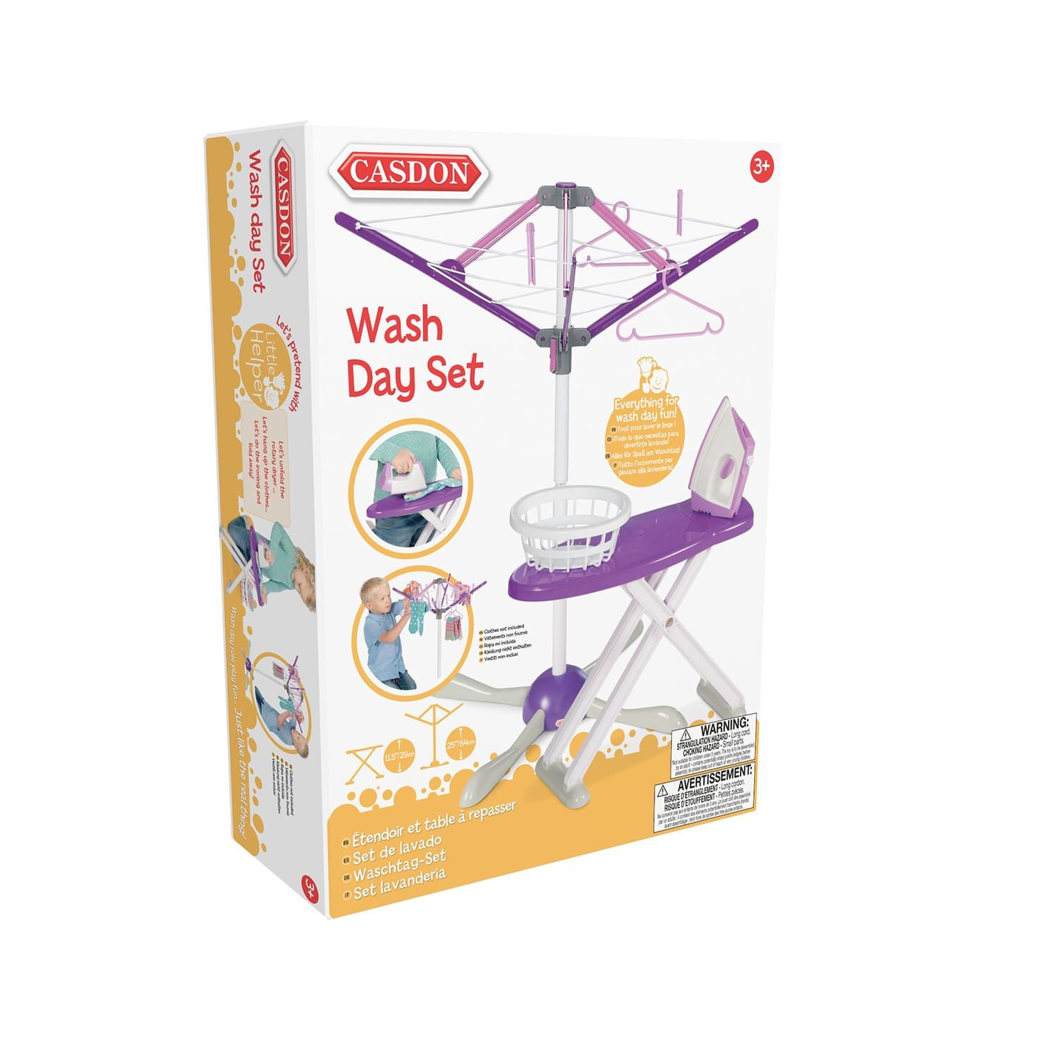- Zestaw Casdon do prania, prasowania i suszenia zawiera pralkę, deskę do prasowania, żelazko, rozkładaną suszarkę do ubranek, koszyczek na pranie, wieszaki i spinacze na ubranka.