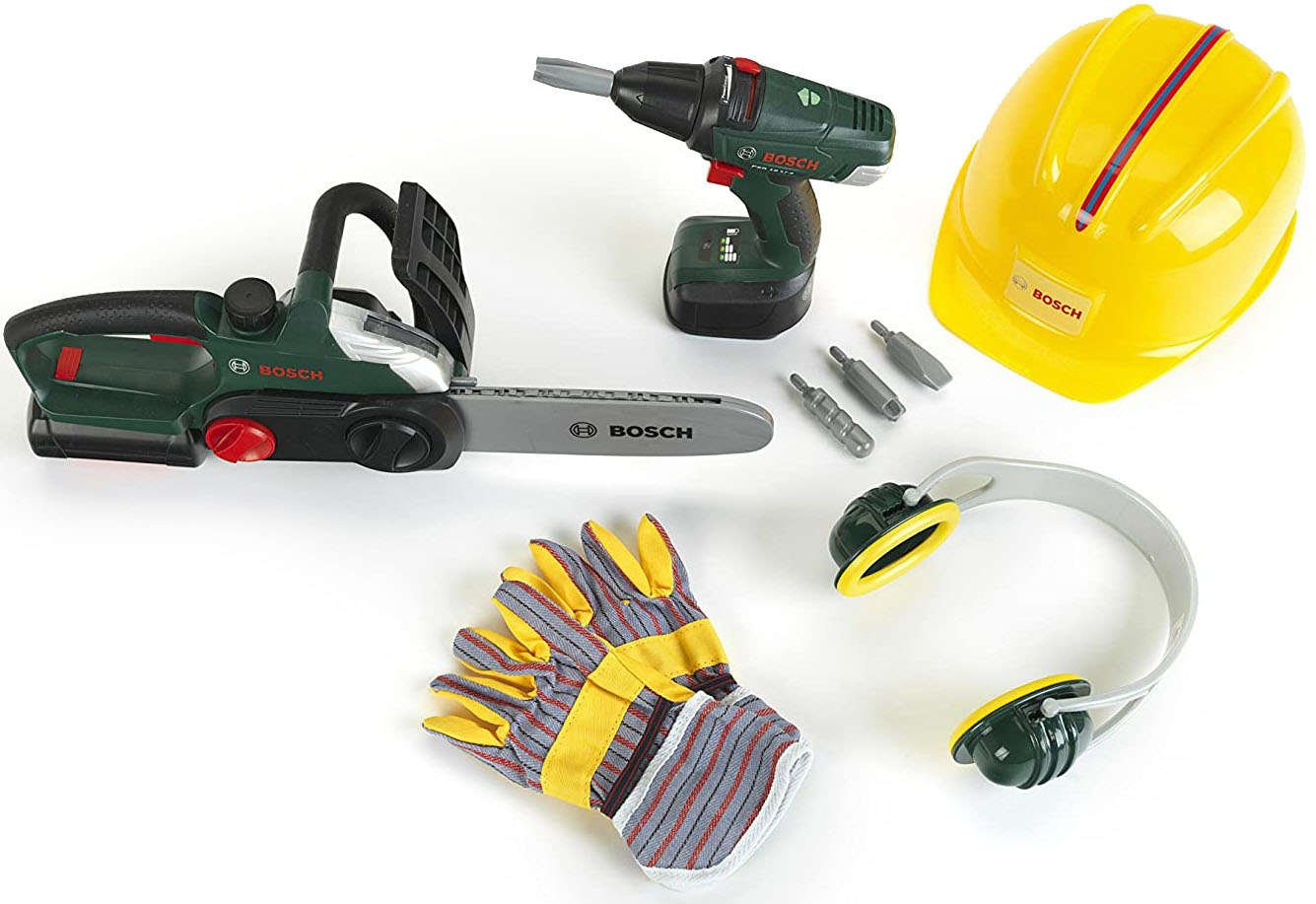 - w zestawie znajduje się piła łańcuchowa Bosch, wkrętarka Bosch, kask, słuchawki, rękawice ochronne
