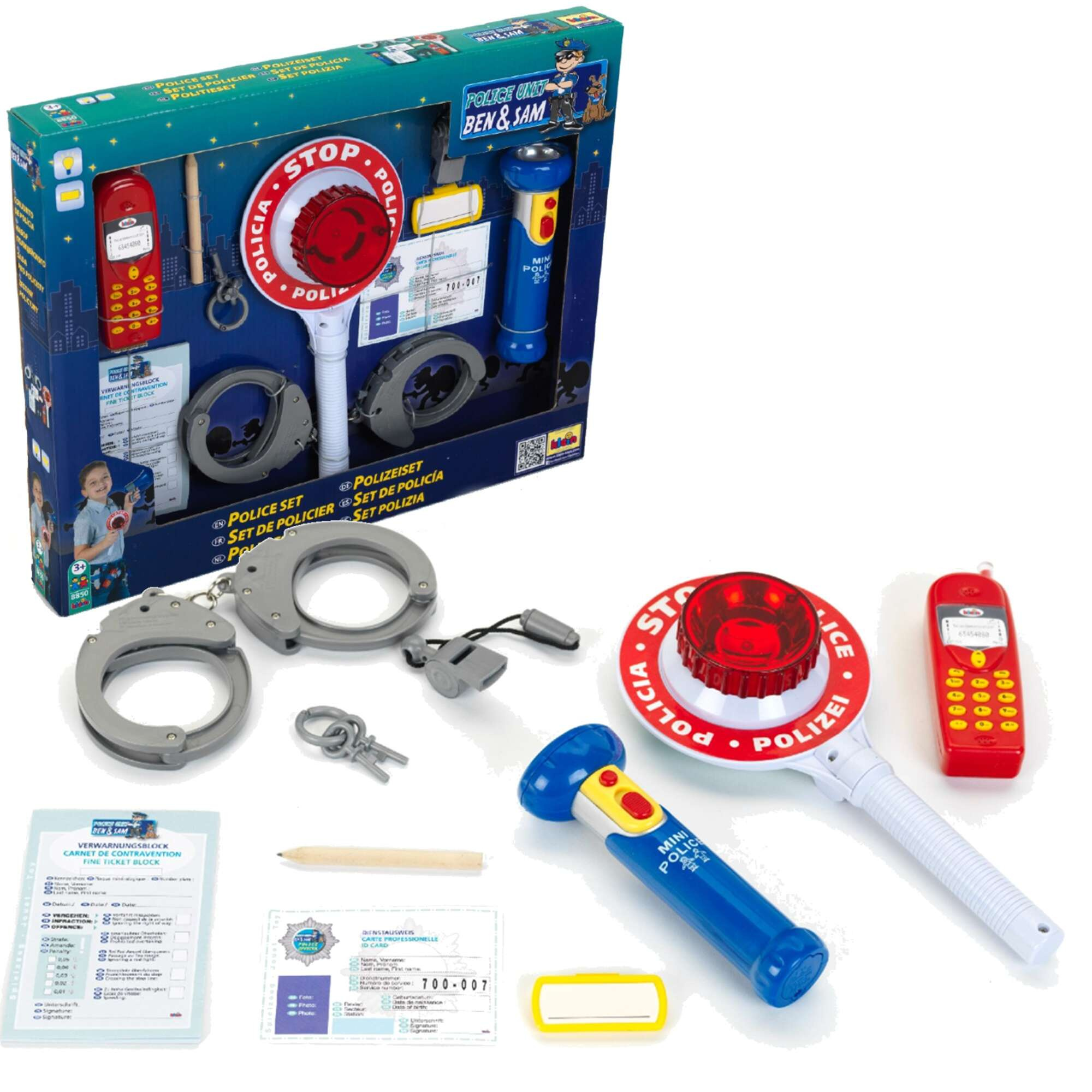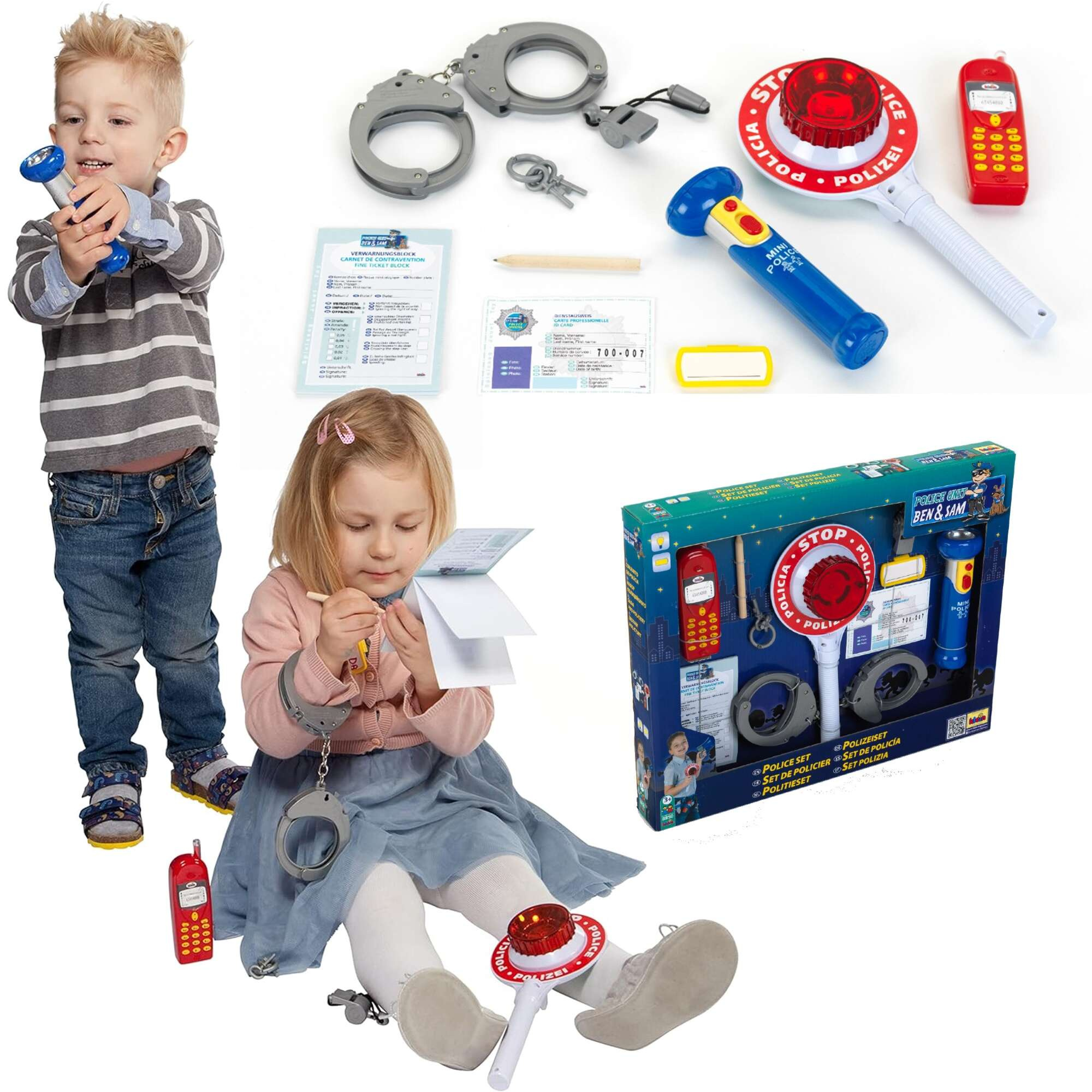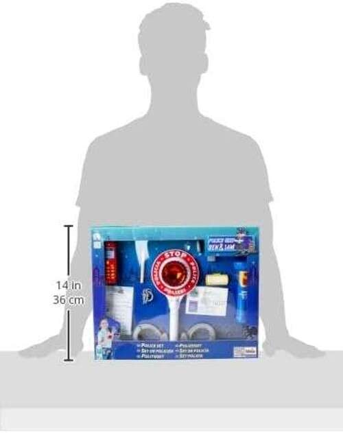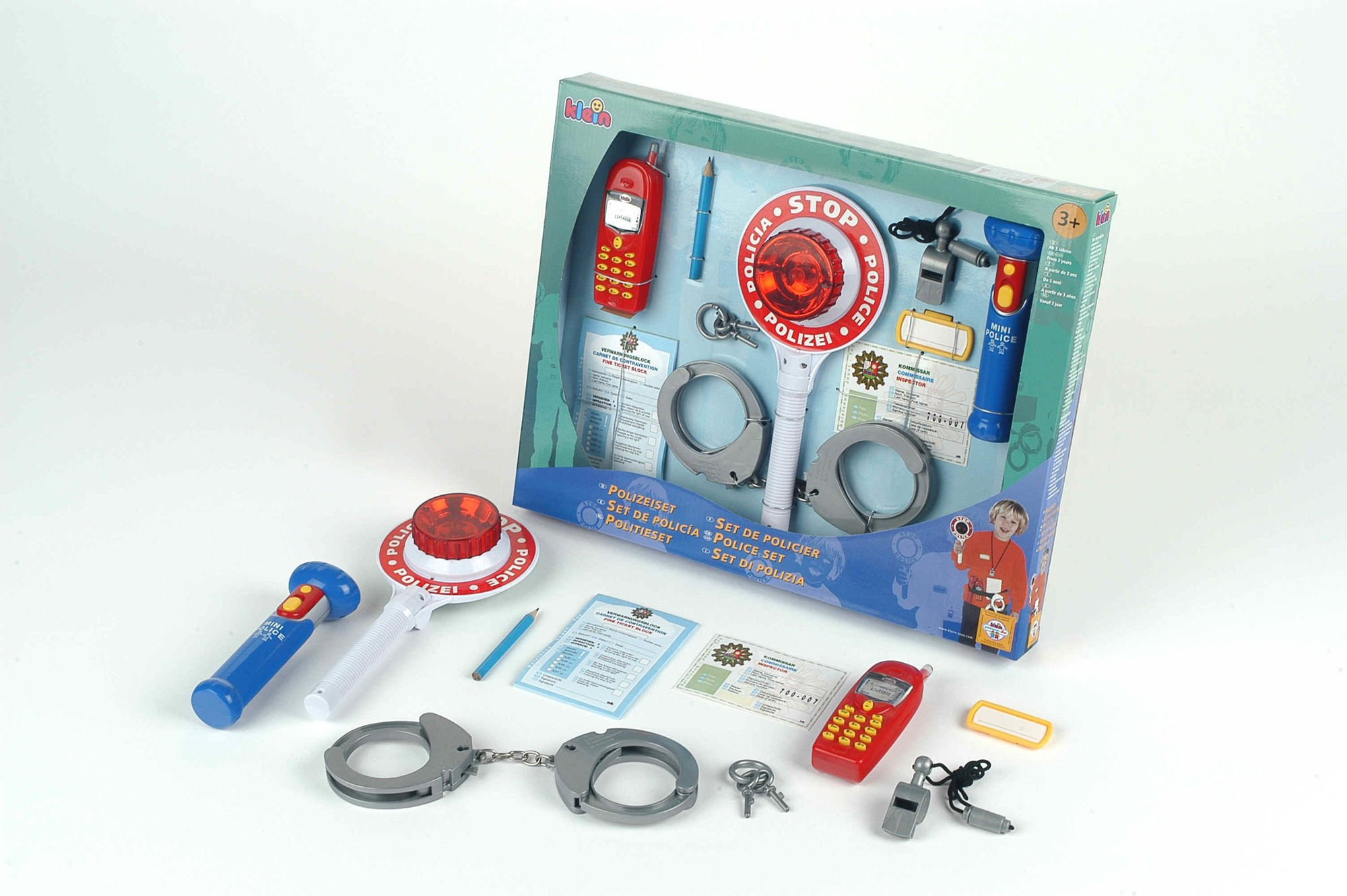 - w skład zestawu wchodzą: legitymacja policjanta, identyfikator na imię, bloczek do mandatów, ołówek, kajdanki, kluczyki do kajdanek, gwizdek-zabawka, latarka, atrapa telefonu komórkowego oraz lizak policyjny