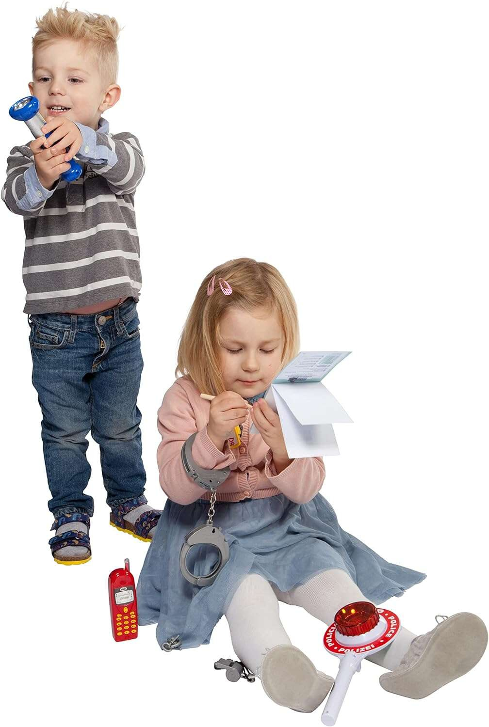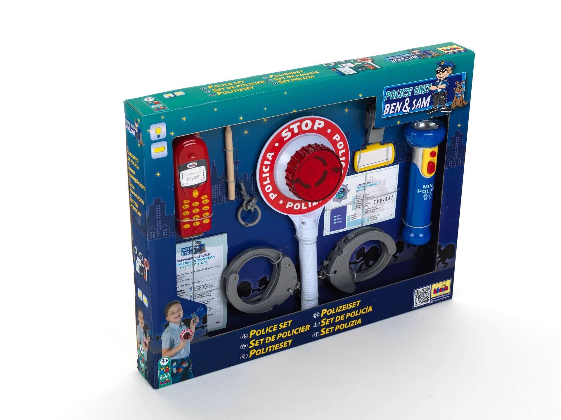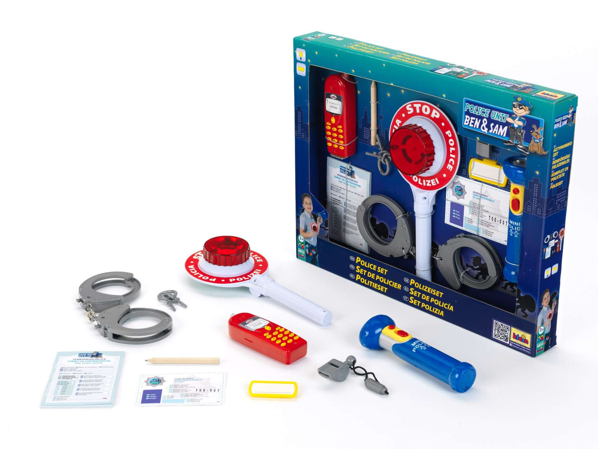 - w skład zestawu wchodzą: legitymacja policjanta, identyfikator na imię, bloczek do mandatów, ołówek, kajdanki, kluczyki do kajdanek, gwizdek-zabawka, latarka, atrapa telefonu komórkowego oraz lizak policyjny