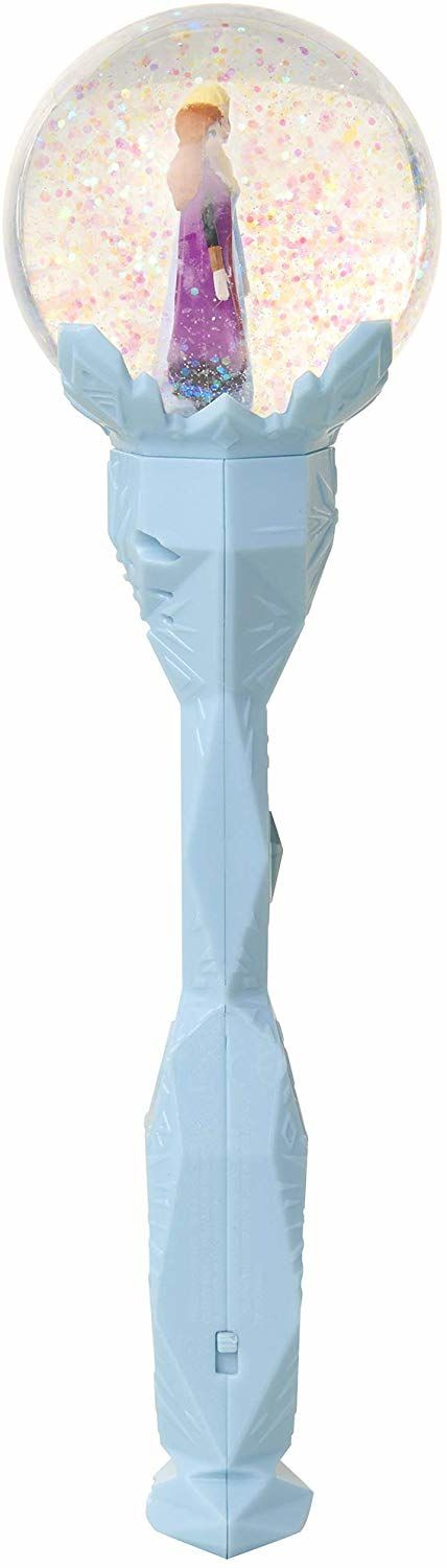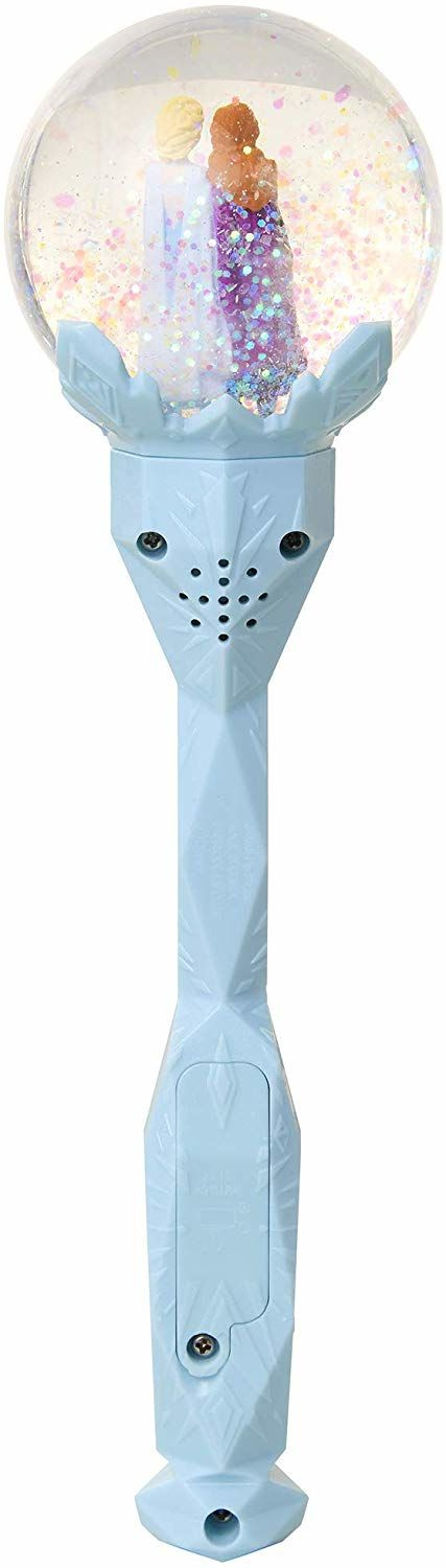 Różdżkę stworzono w łagodnym odcieniu błękitu. Składa się z rączki, na której dodatkowo znajduje się specjalny przycisk, oraz kuli śnieżnej. Wewnątrz kuli śnieżnej znajdują się dwie figurki sióstr: Anny i Elsy, a kula wypełniona jest wodą oraz brokatem, który pięknie się mieni podczas poruszania różdżką. Kiedy dziecko naciśnie specjalny przycisk znajdujący się na rączce, różdżka zagra melodię piosenki z filmu "Into the unknow".