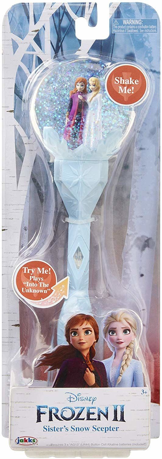 - Kraina Lodu 2 Frozen - Muzyczna śnieżna różdżka z efektem dźwiękowym - melodią z bajki oraz kulą śnieżną. Wewnątrz kuli śnieżnej znajdują się dwie figurki sióstr: Anny i Elsy, a kula wypełniona jest wodą oraz brokatem.